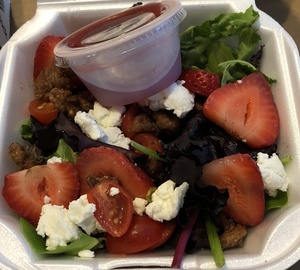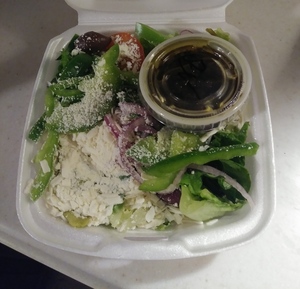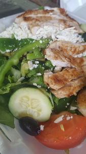 Served with a small greek salad on the plate and Tzatziki Sauce
