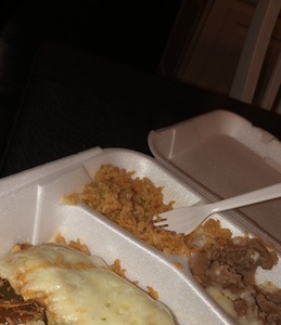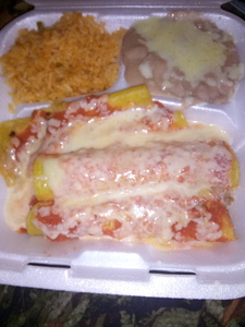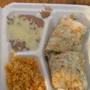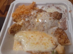 Create your own favorite dinner. (Only 1 of each selection). All Combination Dinners are served with Refried Beans and Mexican Rice with Your Choice of Ground Beef or tender, spicy Chicken