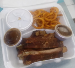 Ribs, Baked Beans, Potato Salad, Coleslaw, Buns and Sauce