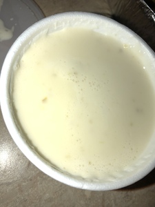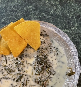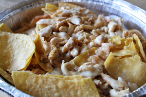 Covered with cheese dip.