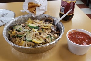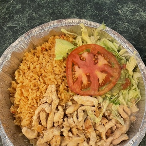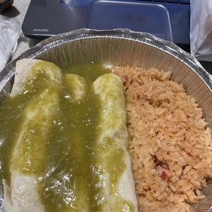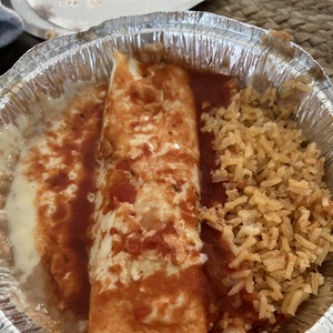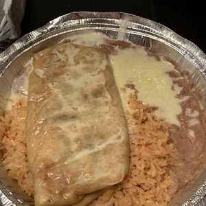 A 13-inch flour tortilla with one of the following fillings, plus rice, beans, lettuce, tomatoes, onions, cilantro, and cheese inside. Served with a side of rice and beans.