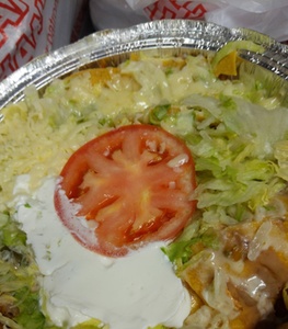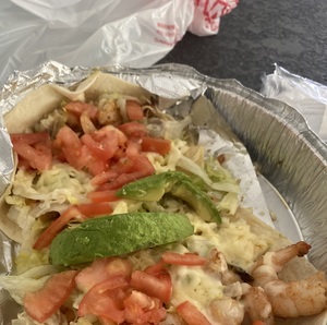 A deep fried flour tortilla with options below with onions, peppers, and tomatoes. Covered with cheese sauce. Served with rice, refried beans and salad