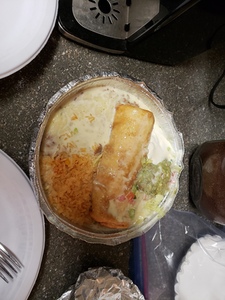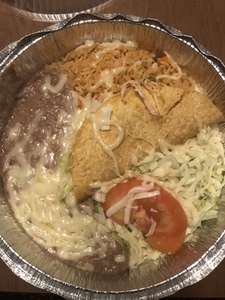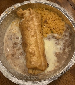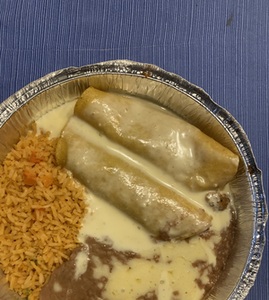 Served with Mexican rice and beans. A flour tortilla filled with cheese, beans and your choice of meat. Deep Fried to a golden brown and topped with cheese sauce, lettuce, sour cream, guacamole and pico de gallo