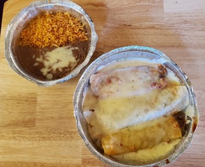 Deep-fried burrito topped with cheese & enchilada sauces served with rice, beans, guacamole & sour cream