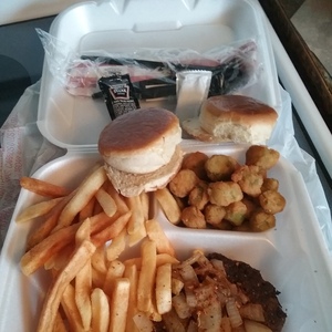 Served with a rolland 2 Sides: Mashed Potatoes, Pinto Beans, Fried Okra, Coleslaw, French Fries, Salad, Tater Tots,Onion Rings or a Potato w/Butter & Sour Cream (for $1.25 extra)